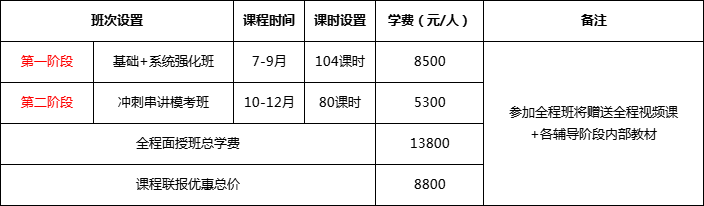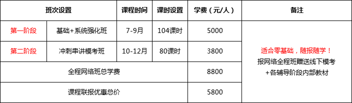 基礎(chǔ)班:循序漸進,理清各科考點;夯實基礎(chǔ),做到溫故知新; 穩(wěn)扎穩(wěn)打,構(gòu)建思維模式;透析考點,形成學(xué)習(xí)體系。系統(tǒng)班:全面復(fù)習(xí),強化技巧;系統(tǒng)歸納,總結(jié)考點;結(jié)合真題,重點突破;運用技巧,快速解題。模考串講班:突破重點題型,查漏補缺;體驗全真考場,調(diào)整心態(tài);分配答題時間,有的放矢;模擬強化訓(xùn)練,總結(jié)規(guī)律;把握命題規(guī)律,預(yù)測考向考點歸納總結(jié),查漏補缺;預(yù)測命題態(tài)勢,輕松上陣。報全程面授班:基礎(chǔ)班+系統(tǒng)強化班+沖刺串講??及?13800元/生。7月13日前報班享特大優(yōu)惠價8800元/人(贈送價值5800元全程視頻課+各輔導(dǎo)階段內(nèi)部資料)。1、報全程網(wǎng)絡(luò)班:基礎(chǔ)班+系統(tǒng)強化班+精講模串班=8800元。7月13日前報班享受特大優(yōu)惠價5800元/人。2、報網(wǎng)絡(luò)班送:贈送???各輔導(dǎo)階段內(nèi)部資料。3、網(wǎng)絡(luò)視頻課針對沒有時間參加面授班學(xué)員,手機、電腦下載APP可自由安排時間學(xué)習(xí),費用低,效率高。