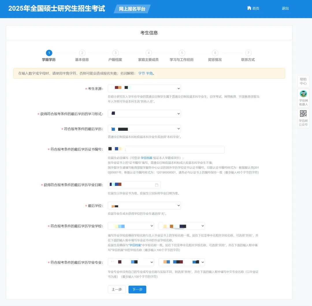 確認實名注冊信息后,考生首先要按照《2025年全國碩士研究生招生工作管理規(guī)定》要求填寫正確的學歷(學籍)信息。