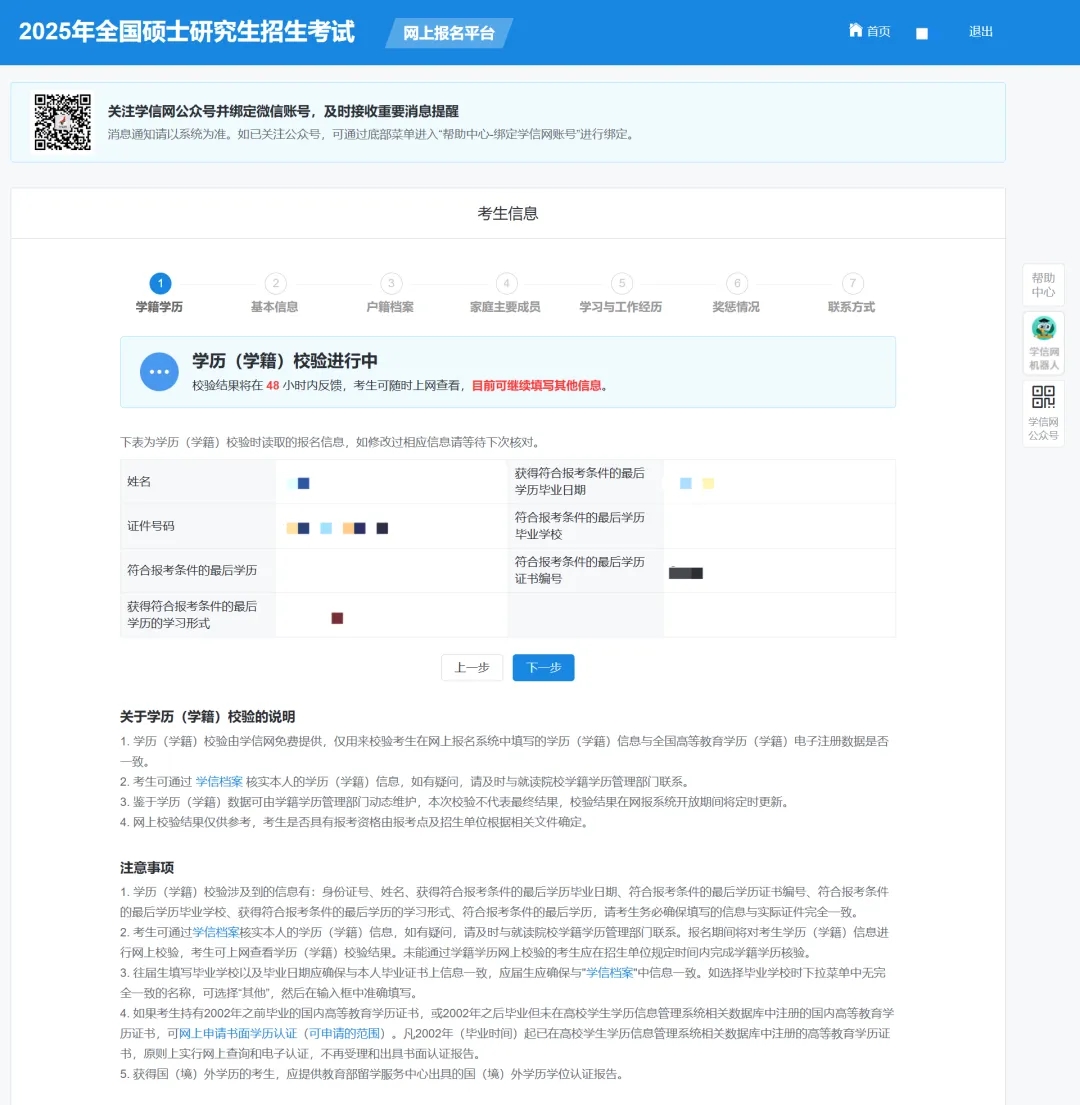 一般情況下,學歷(學籍)信息是可以快速校驗的。如遇網(wǎng)絡(luò)擁堵等特殊情況,可能會出現(xiàn)“學歷(學籍)校驗進行中”的狀態(tài),這不會影響接下來的操作,考生可以繼續(xù)填寫考生信息中的其他部分。