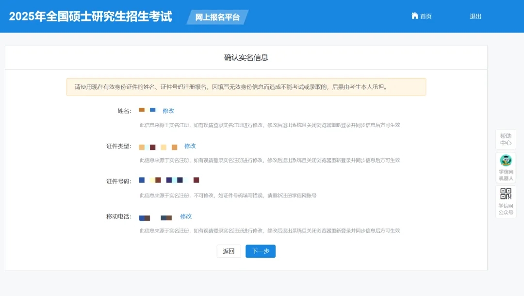 登錄之后,需先確認實名信息(此信息來源于學信網(wǎng)實名注冊信息,請考生仔細核對)。