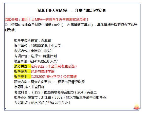 我校2026年MPA招生指標(biāo)非全日制計(jì)劃130個(gè)。具體招生指標(biāo)與當(dāng)年研招辦下達(dá)計(jì)劃數(shù)為準(zhǔn),根據(jù)考生的入學(xué)考試成績和復(fù)試成績由我校自主劃定分?jǐn)?shù)線擇優(yōu)錄取。1、非全日制(定向)公共管理碩士(MPA)研究生,人事檔案及工資關(guān)系不轉(zhuǎn)入學(xué)校,培養(yǎng)采取非脫產(chǎn)學(xué)習(xí)方式。2、授課方式:授課方式強(qiáng)調(diào)課堂講授、案例分析、小組討論、學(xué)生自學(xué)、社會(huì)調(diào)研、專題講座相結(jié)合。 非全日制學(xué)制3年,采取周末授課形式。學(xué)生學(xué)習(xí)期滿、修滿培養(yǎng)方案規(guī)定學(xué)分、成績合格,并完成學(xué)位論文等規(guī)定培養(yǎng)環(huán)節(jié)者,授予湖北工業(yè)大學(xué)非全日制公共管理碩士(MPA)學(xué)位和研究生畢業(yè)證書。 非全日制全程培養(yǎng)費(fèi):待定(含論文指導(dǎo)費(fèi)、答辯費(fèi)),不含教材費(fèi)。如學(xué)校學(xué)費(fèi)有變動(dòng),最后以物價(jià)局核定收費(fèi)標(biāo)準(zhǔn)收取。 重要提示:學(xué)籍注冊(cè)后,學(xué)生因個(gè)人原因不能堅(jiān)持學(xué)習(xí)的,視為自動(dòng)退學(xué),費(fèi)用不退! 為了提高2026年報(bào)考學(xué)生錄取率,麗水開大教學(xué)點(diǎn)十幾年來一直全程特聘浙大、浙師大、南京等知名高校MBA、MPA名師舉辦考前輔導(dǎo)班,歷年上線率高;報(bào)全程輔導(dǎo)班《免費(fèi)贈(zèng)送全程網(wǎng)課+輔導(dǎo)資料》,歡迎大家報(bào)班! 公共管理MPA、工商管理MBA、高級(jí)工商管理EMBA、工程管理MEM、旅游管理MTA、會(huì)計(jì)碩士MPACC、審計(jì)碩士MAUD、圖書情報(bào)MLIS均可參加管理類統(tǒng)考筆試輔導(dǎo)加油站!基礎(chǔ)班+系統(tǒng)強(qiáng)化班+沖刺串講??及?/strong>面試+直播+網(wǎng)課=助你成功上岸?。?/strong>