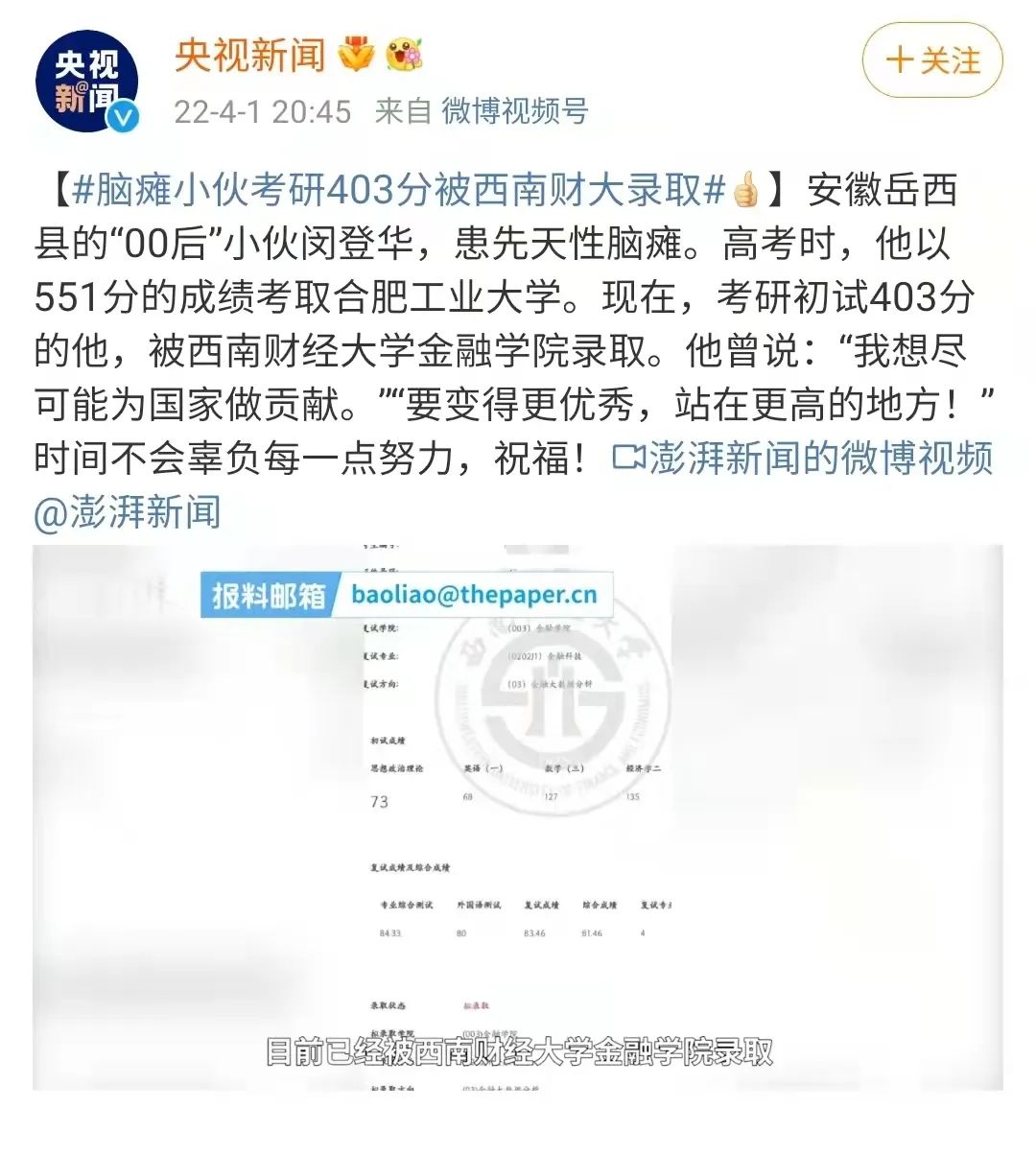 403分對(duì)普通考研人來說,已是難以觸及,對(duì)這樣一個(gè)“腦癱患者”來說更是不易。